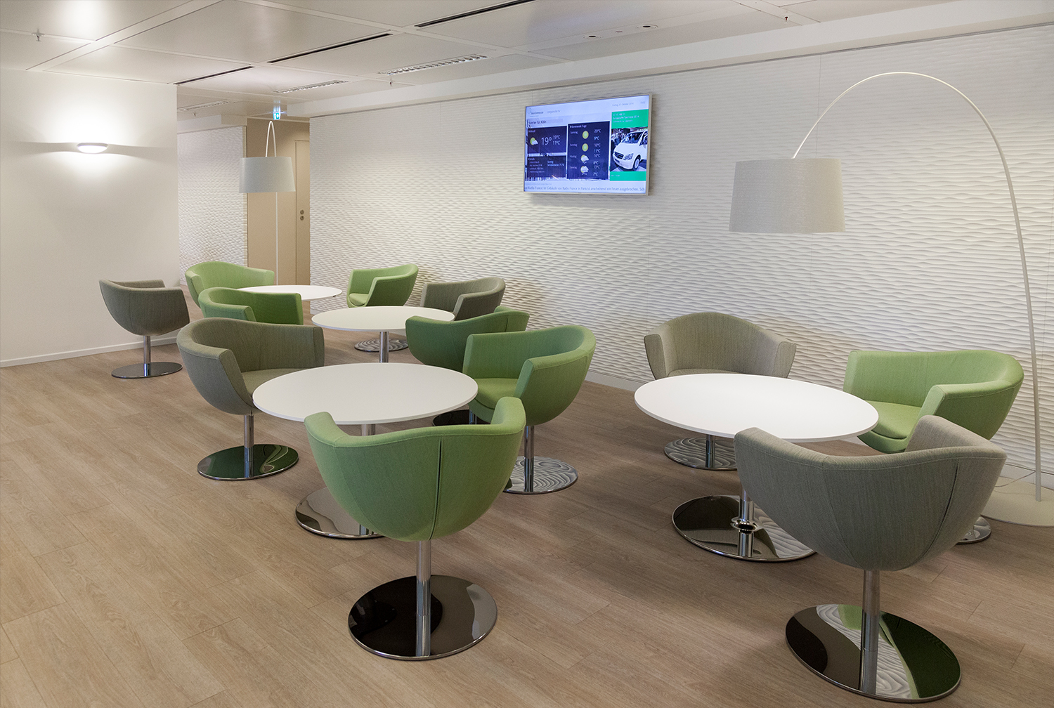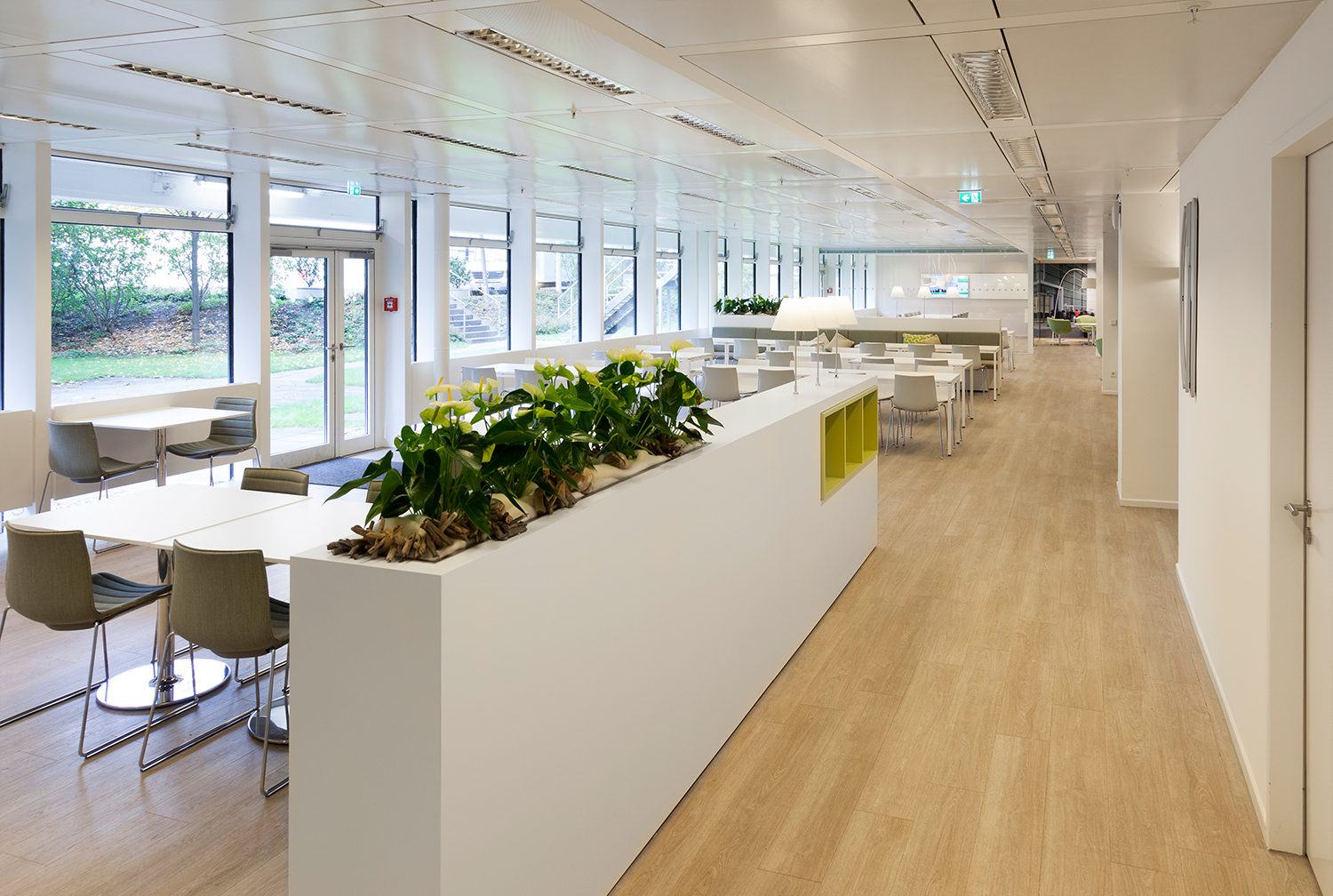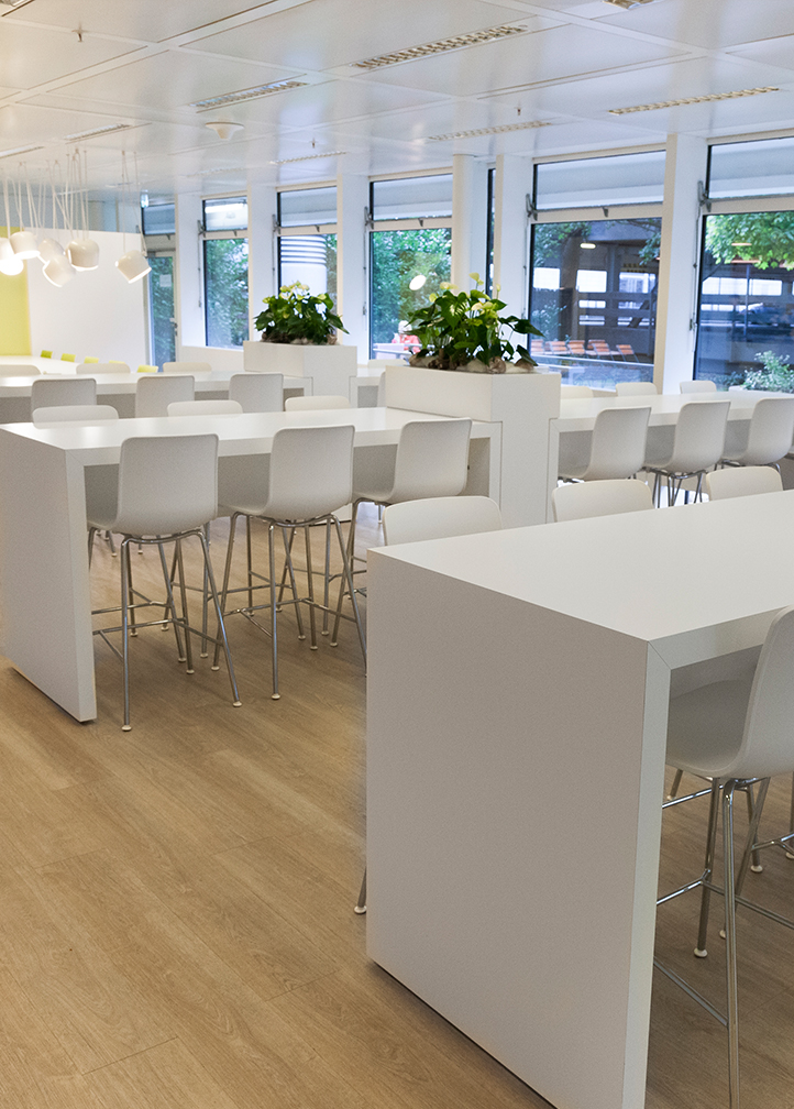 Ein großer, ganz in Weiß gehaltener und lichtdurchfluteter Raum, in dem für jedes Sitzbedürfnis eine passende Möglichkeit gegeben war, das sollte die Kantine der Köln-Messe werden. Hell, freundlich und trotz der Größe des Raumes einladend mit Kommunikationsinseln.