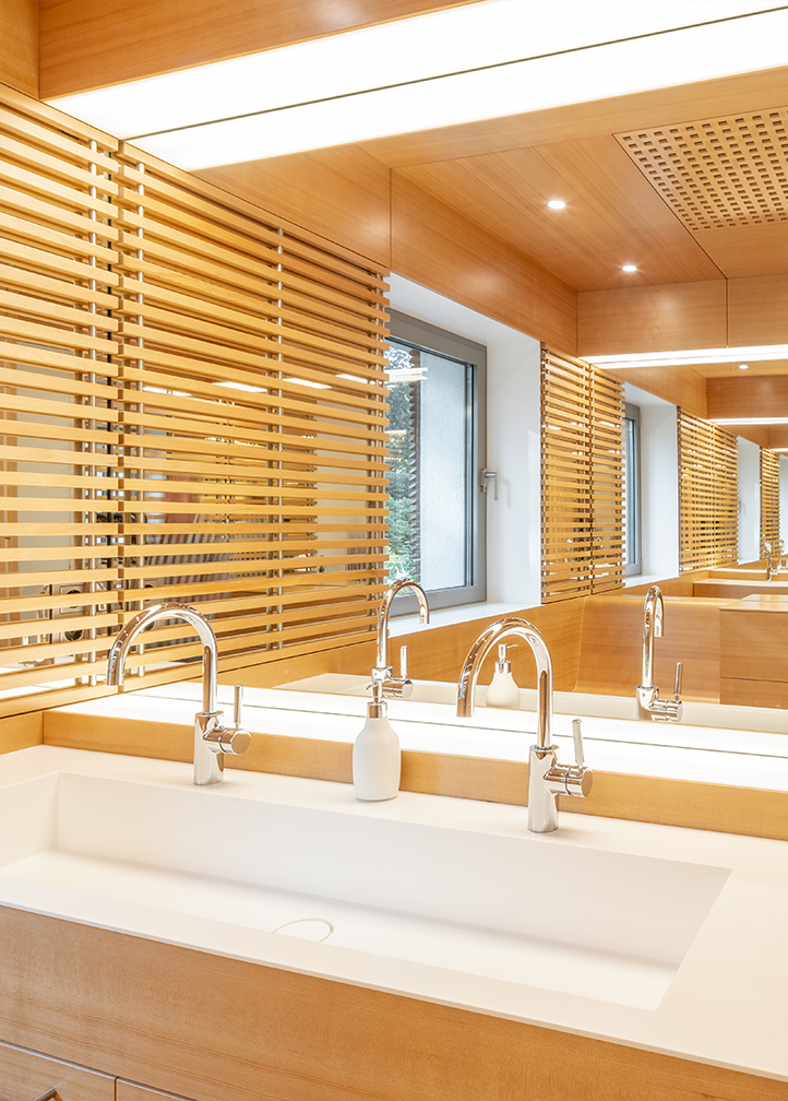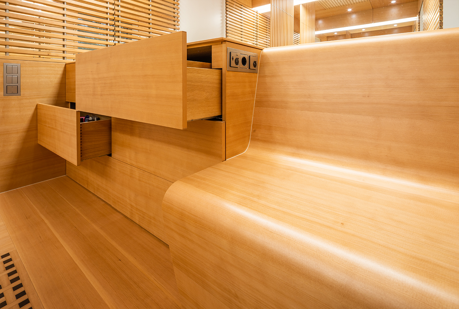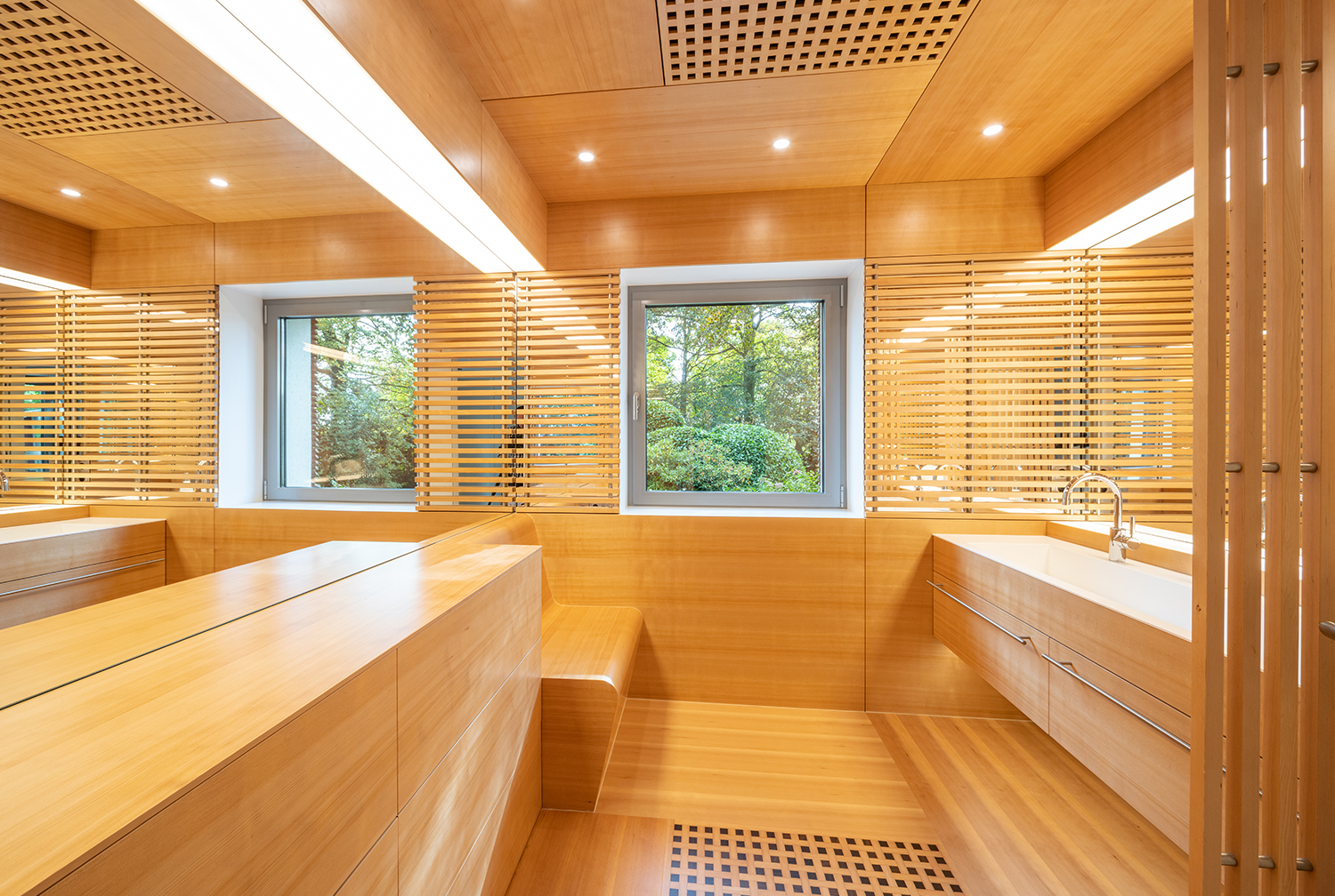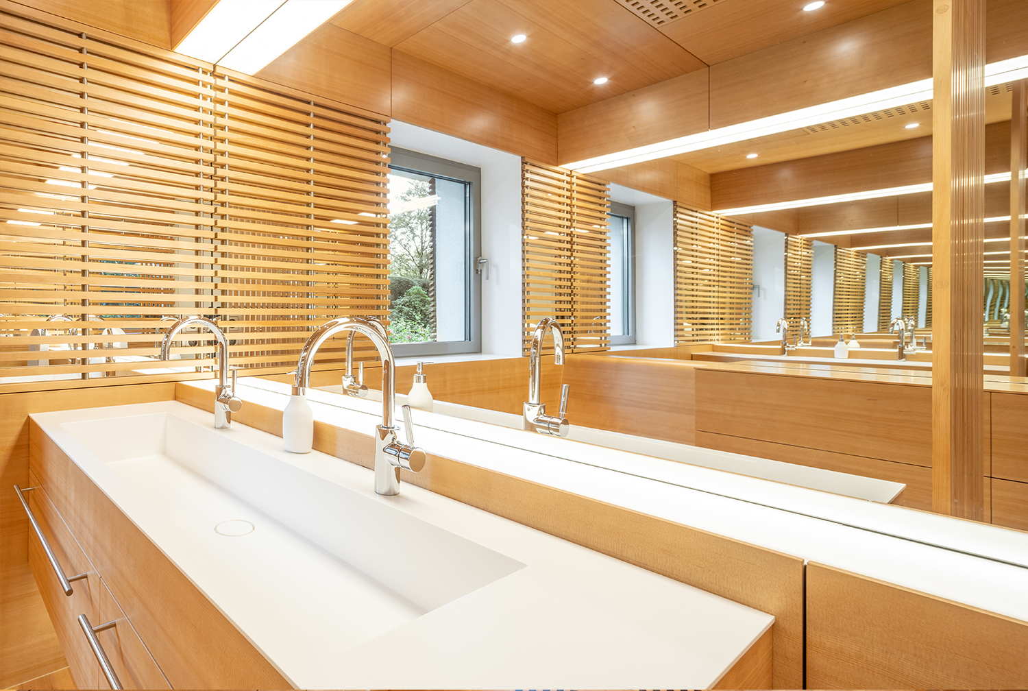 Gespiegelt ist der Raum an der vertikalen Achse nicht nur übertragend, sondern auch ganz direkt. Zwei sich gegenüberliegende weite Spiegelflächen lassen den Raum unendlich groß erscheinen. Da, wo auf der einen Seite ein langes, in einen hängenden Unterschrank integriertes Doppelwaschbecken mit fugenfreier Corian®-Oberfläche in Weiß strahlt, lädt gegenüber eine beheizte Sitzbank zum Verweilen ein. Großzügige Schubladenschränke geben erst bei Tip-On-Öffnung ihren Innenraum preis, flächenbündige Taster für die Raumbeleuchtung schmiegen sich in das Holz.