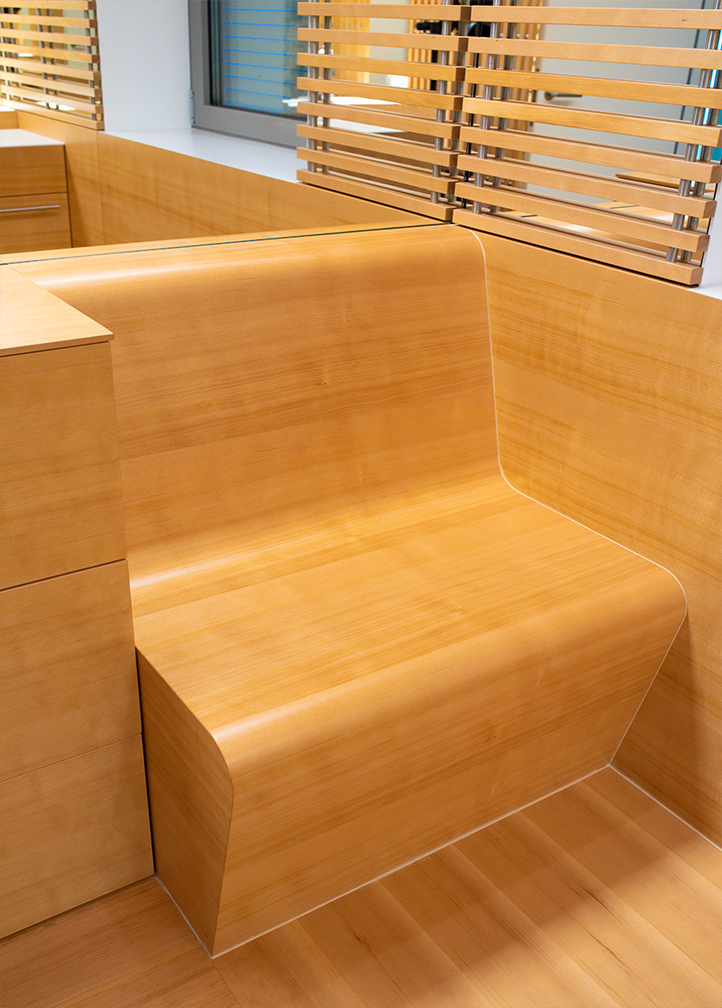 Bei diesem Projekt wurden die üblichen Anforderungen grundsätzlich umgekehrt. Wo sonst die Aufgabenstellung lautet: „Verkleiden Sie das Holz mit Stein und Kunststoff“, wurde hier eine Rauminnenhülle in Holz gewünscht.